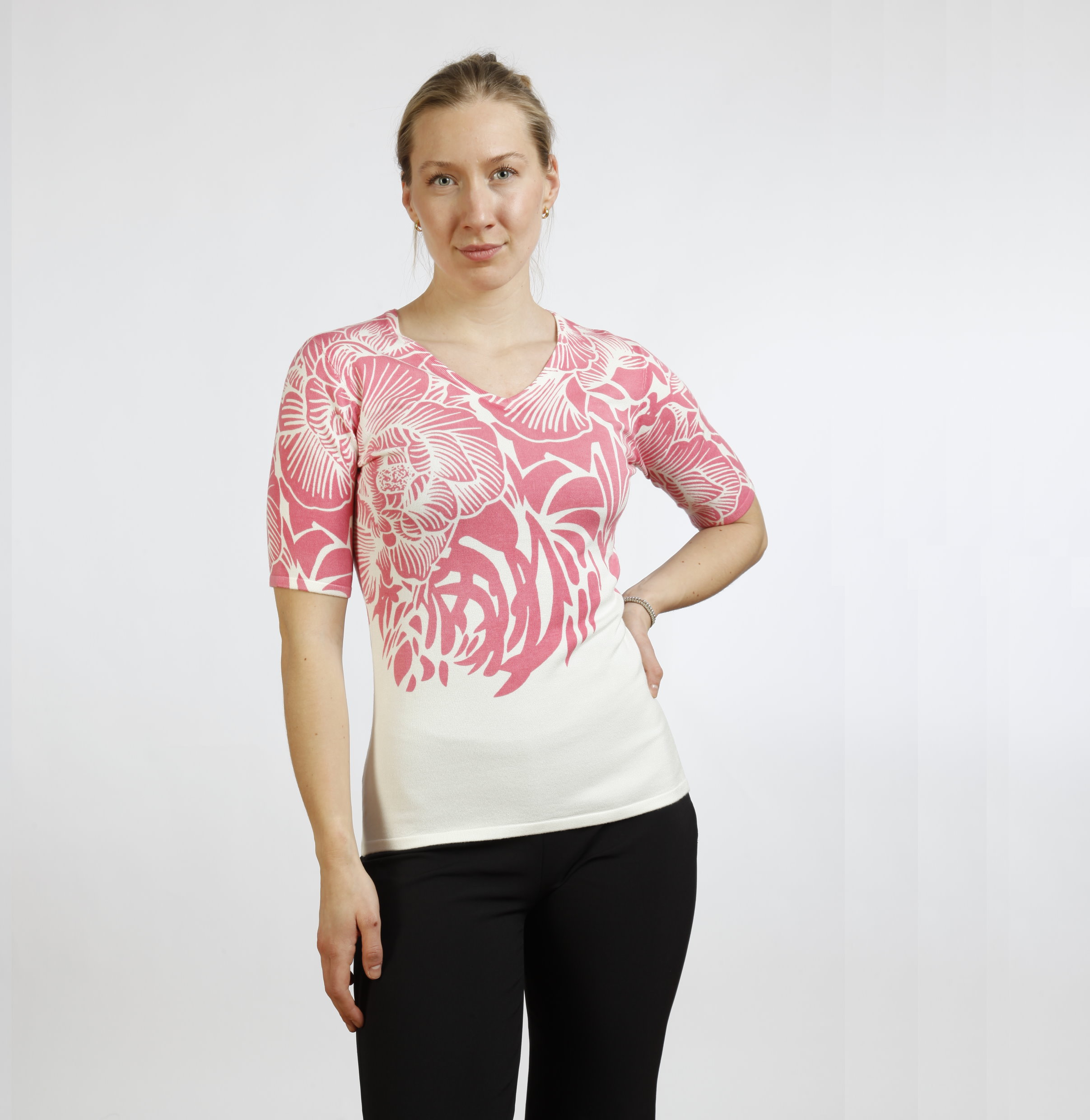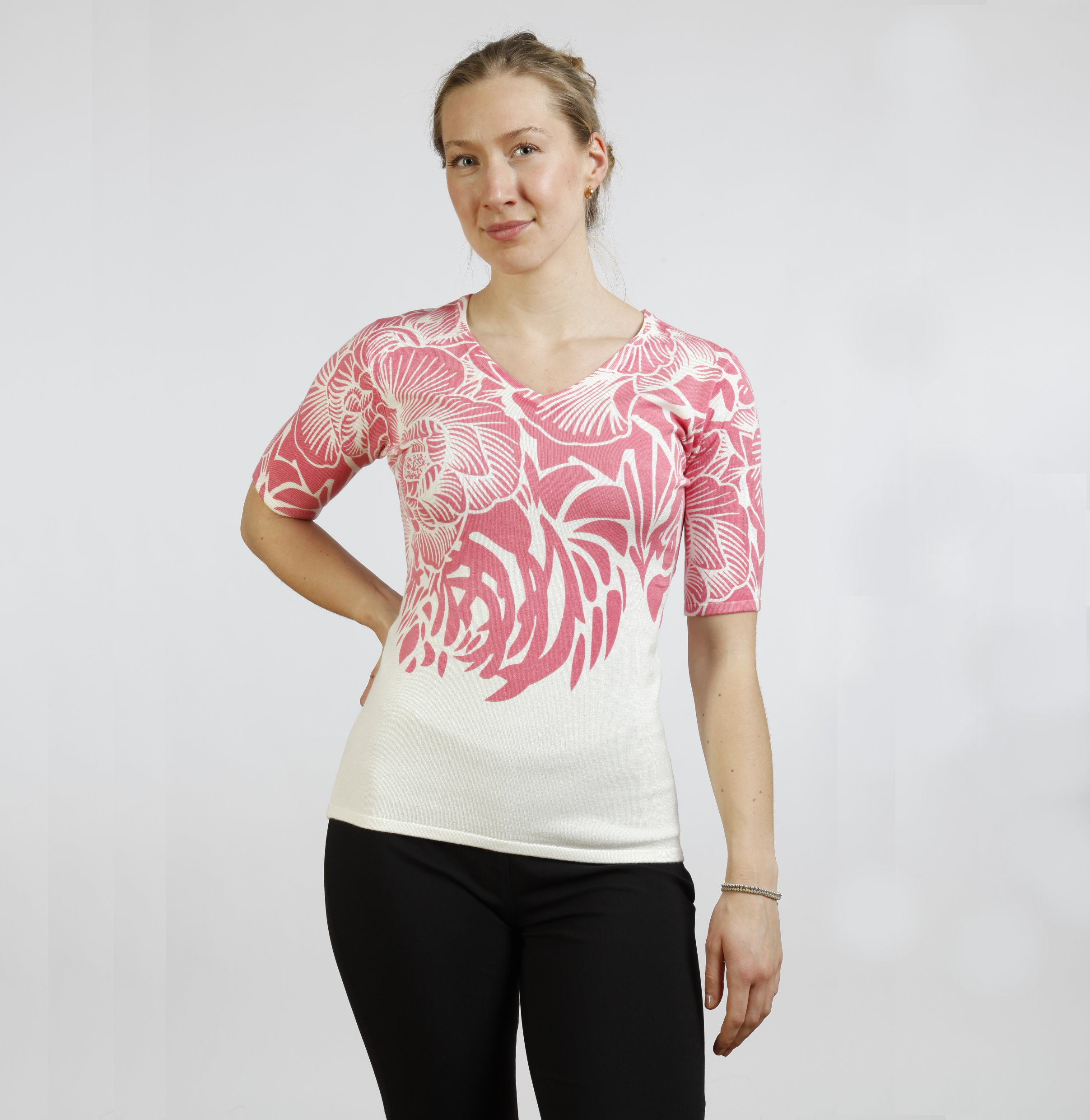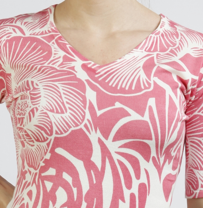 V-Ausschnitt mit 1/2 Arm, Fantasieddruck, 80%Viskose, 17%Polyamid, 3%Elasthan